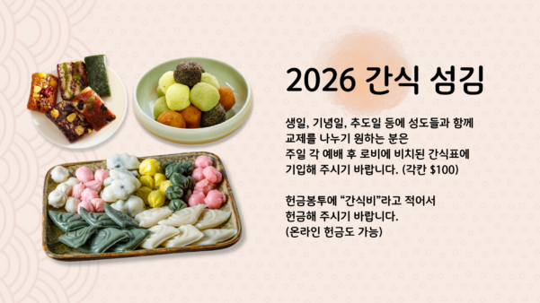 생일, 기념일, 추도일 등에 성도들과 함께 교제를 나누기 원하시는 분은 주일 각 예배 후 로비에 비치된 간식표에 기입해 주시기 바랍니다. (각칸 $100)