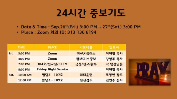 All 일정표 일정(이벤트)이 종료되었습니다. 9월 24시간 기도회 9월 26 @ 3:00 오후 - 9월 27 @ 3:00 오후 캘린더에 추가하기 구글 캘린더에 추가하기 iCalendar Outlook 365 Outlook Live Details Start: 9월 26 @ 3:00 오후 End: 9월 27 @ 3:00 오후 Event Category:24시간 기도회 담당자 이혜영 목사 Email: hyeyounglee@hyungjae.org 장소 바셀 캠퍼스 빌딩 1 3727 240th St SE Bothell, 98021 United States + 구글 지도 Phone: 4254881004 Website: 장소 웹사이트 보기